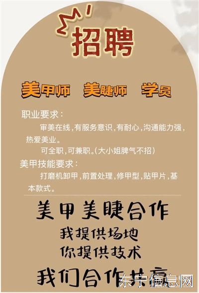 招聘美甲美睫師成手、老板人好事少、 長期招學員、學會可留店! 工作時間早8:00——16.30、工資面談 ??:199 0483 1056微信電話同步